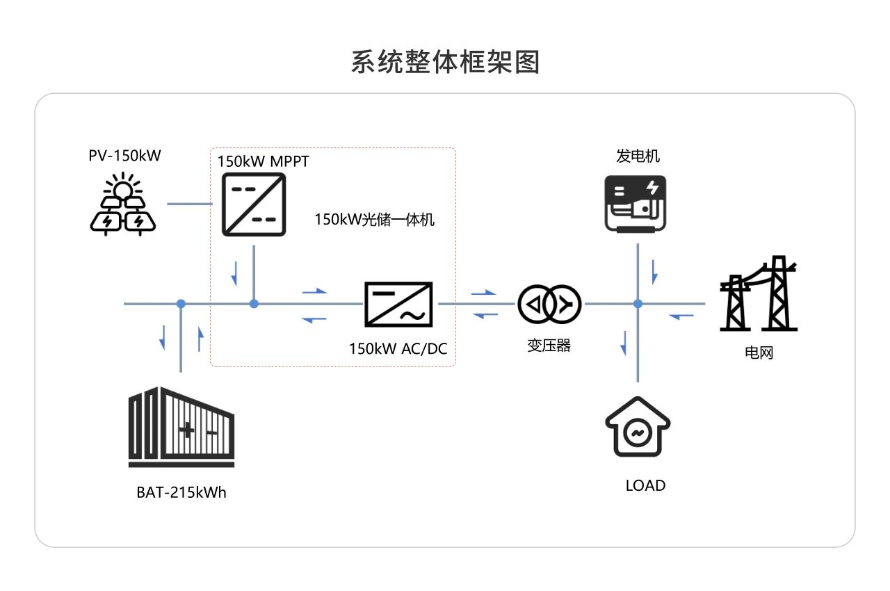 系統主要由光伏板、150KW 光儲一體機(包含交流配電、變壓器、光伏逆變 DC/AC模塊、儲能 DC/DC 模塊、監控系統等)、215KWh儲能電池柜組成,外部客戶端配備柴油發電機。系統具備以下主要功能: