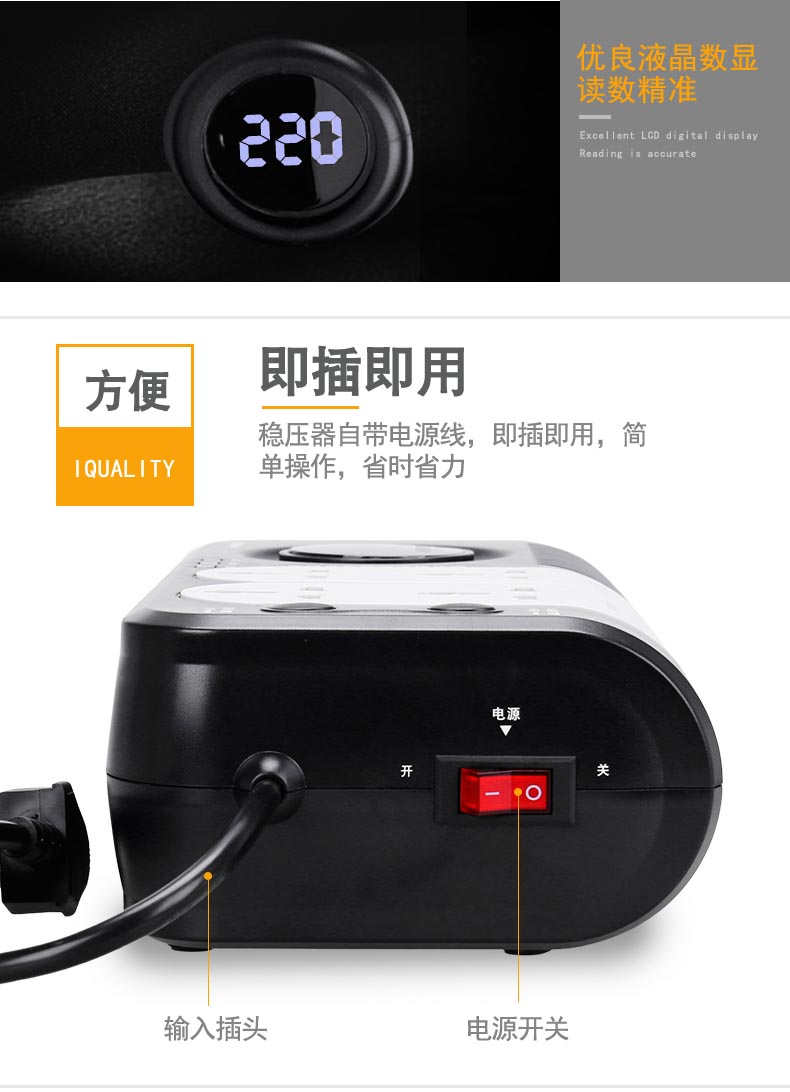 產品簡介: PR-2000系列是我公司新開發的一款全自動智能型便攜式穩壓器,為滿足日益增加的便攜式電源的需求而設計,該穩壓器擁有緊湊和時尚的外觀,蜂鳴報警、智能過載保護等功率。 適用于1000W以下的負載設備,如電腦、電視、冰箱、麻將機等小功率家電設備和數碼產品。