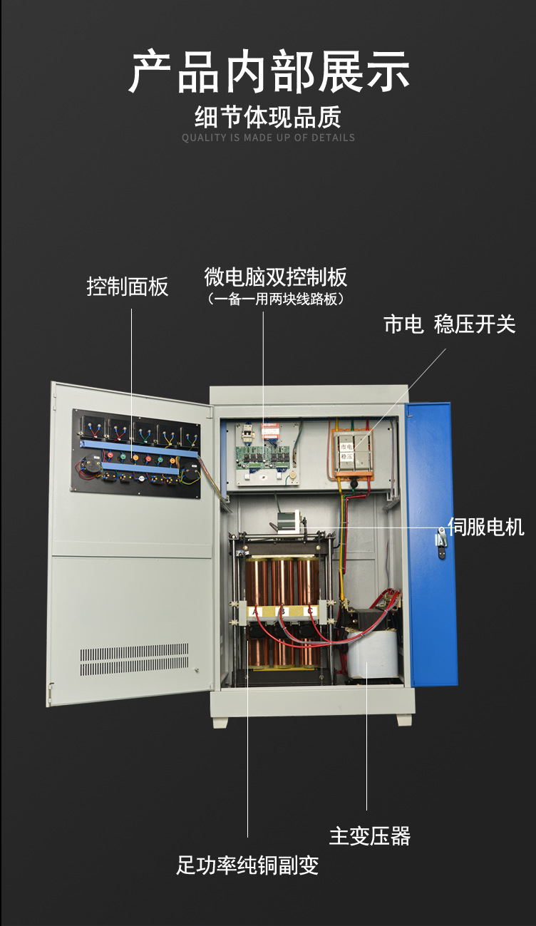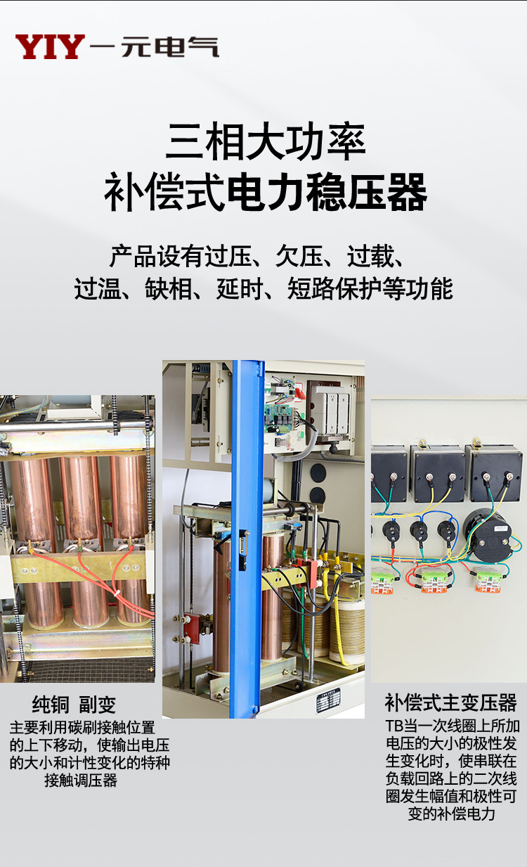 SBW系列三相全自動補償式電力穩壓器,具有容量大、效率高、精度高、穩壓范圍寬、保護功能強、無波形畸變、電壓調節平穩、運行可靠及使用維護簡單等優點。適合負載廣泛,能承受瞬時過載,可長期持續工作,設有過壓、過流、缺相、相序保護及機械故障自動保護。該穩壓器由補償模塊、AD采樣模塊、單片機控制模塊、升壓/降壓等操作模塊、系統供電模塊及顯示模塊等幾大模塊組成