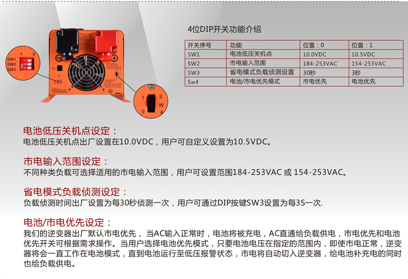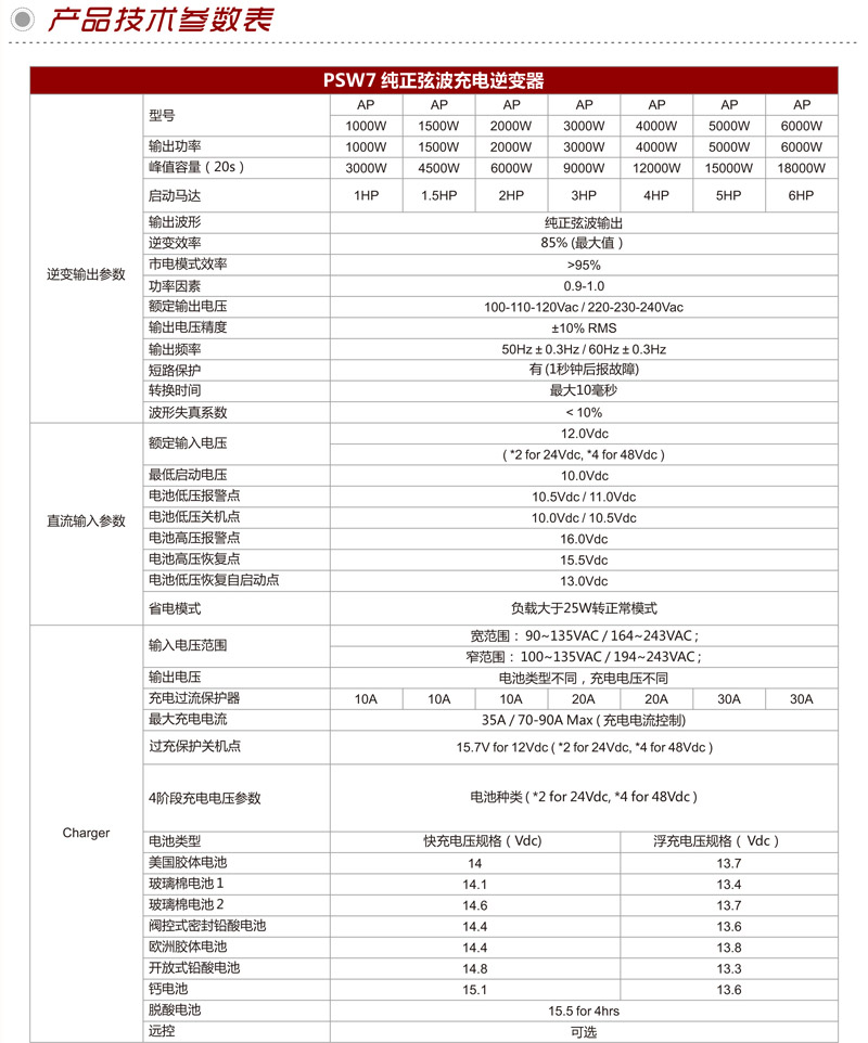 PSW7系列純正弦波逆變器集合逆變器,充電機和自動交流轉換開關為一體的多功能逆變器,轉換效率可高達88%。