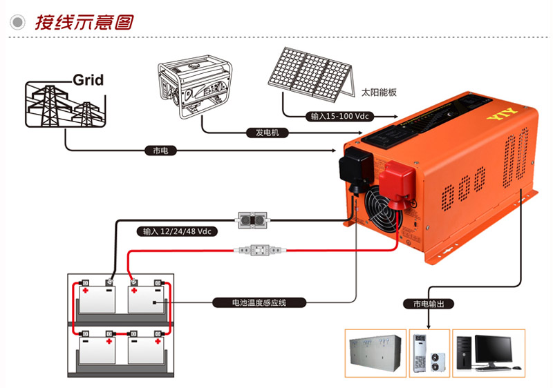 由于其獨特的功能,使得其成為目前市場上先進的逆變器和充電機。特性有功率因素校正,多階段智能充電和純正弦波輸出,并帶有空前的峰值功率以滿足感性負載的電力需求而不危及設備本身